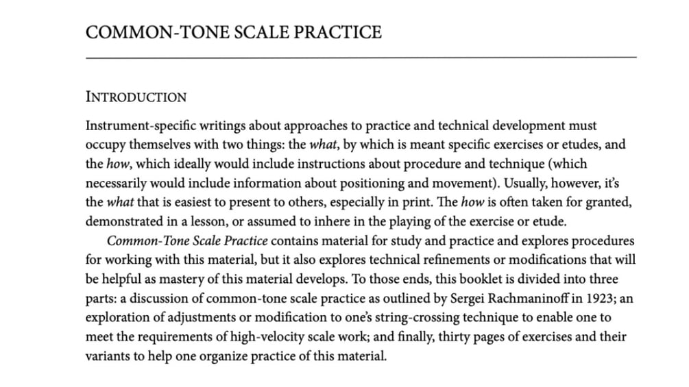 In 1923, pianist and composer Sergei Rachmaninoff outlined a method of scale practice that didn’t rely on rôte learning and which he thought contributed to the world-wide success of Russian pianists in the late nineteenth and early twentieth centuries. This fifty-one page booklet (6500 words, over twenty examples and illustrations, and thirty pages of scales) explores Rachmaninoff's ideas in the context of guitar study. Also included is an in-depth look at modifications to string-crossing technique required by high speeds. A cover page is included in case you wish to take the booklet to a copy shop and have it printed and bound (spiral binding recommended).