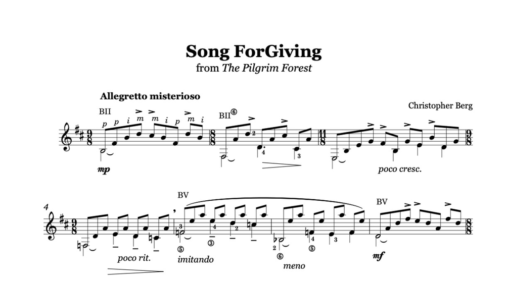 Song ForGiving opens with a song struggling to find its shape. After moving through meter and key changes, the melody finds its voice in a lovely Andante espressivo section. One feature of the work is an extended tremolo section that explores the full range of the guitar fingerboard. The piece is nine pages of music and the recording eight minutes and twenty-three seconds. A concert-level work for advanced players.